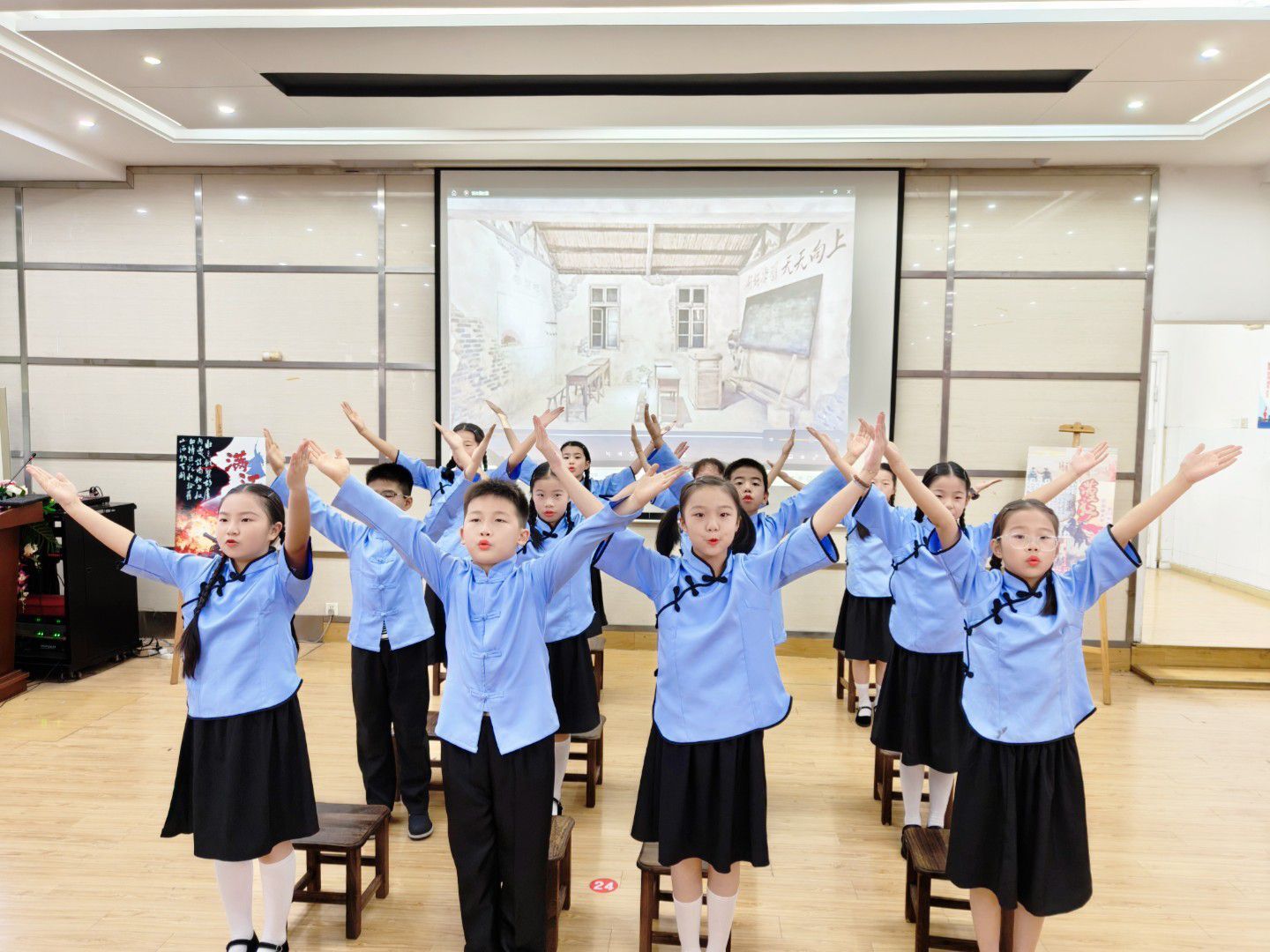 六年级的同窗以沉稳的表演,展示了征程中的艰辛卓绝取豪杰气概。六(1)班的《》将赤军军需处长的取伟大描绘得鞭辟入里,那座耸立风雪中的“”深深烙印正在不雅众心中;紧随其后的《八女投江》则再现了东北抗联女兵士的壮烈一幕,令人动容。六(2)班的《金色的鱼钩》密意诉说了长征上老班长的和友谊取。六(3)班演绎的《小豪杰雨来》,机智英怯的抽象跃然台上。则以澎湃的气焰,再现了五怯士、纵身一跃的英怯,为首场表演画上句号。