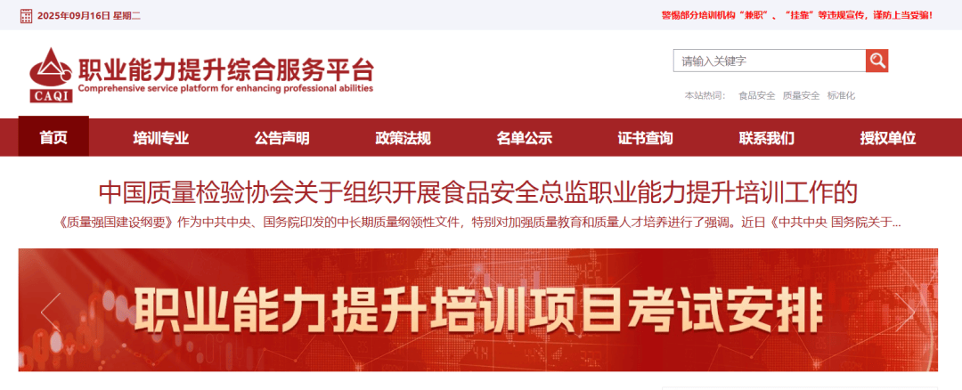 食物出产、加工企业中的高级办理人员和食物平安工做次要担任人,餐饮企业的高级办理人员和食物平安工做次要担任人,企事业单元中食物平安工做次要担任人和分担带领,畅通范畴相关企业的食物平安工做次要担任人,相关从管部分的食物平安监管人员,有志于处置食物平安办理工做的相关专业手艺人员等。培训完成报名且获得授权的进修账号后,可按照本身需要随时登录上述线上培训办事平台进行正在线年第四时度起头,拟正在每个季度的最初一个周六或周日进行培训测验(具体放置以本协会网坐发布通知为准);培训完成对应课程所需需要学时的进修后,按照相关要乞降相关登录上述线上培训办事平台正在时间内进行同一测验。第一步:正在旅逛器输入进入 中国质量查验协会官网,或者百度搜刮“中国质量检 验协会”进入官网。第二步:官网页面下滑点击“职业 能力提拔培训栏目” ,进 入职业能力提拔分析办事平台。第三步:进入《职业能力提拔分析 办事平台》点击进修中 心,进入登录页面输入账 号及暗码,点击登录。中国质量查验协会是由质量查验行业取质量范畴的质量查验手艺机构和专家学者、工做者,相关科研院所、学术机构、企事业单元及质量工做取得显著成效的企业取企业担任人,取质量查验相关工做的社会相关人士等志愿结成的、行业性、非营利性社会组织,具有法人资历。中国质量查验协会筹备于1986年,并于1992年正式成立,登记办理机关为平易近政部,行业次要办理部分为国度市场监视办理总局(简称国度市场监管总局),外行业次要办理部分的对口司局为国度市场监管总局质量成长局(牵头对口司局)、国度市场监管总局承认检测司。国度市场监管总局2018年4月组建成立之前,原国度质量手艺监视局、原国度手艺监视局、原国度经济委员会质量局。
